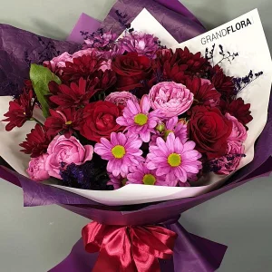 Бархатные ночи- букет из хризантем, роз и лилий