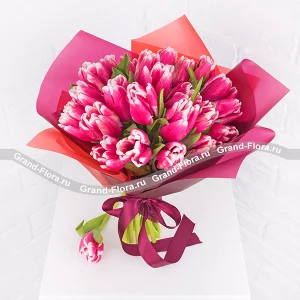 Весенняя серенада - букет из фиолетовых тюльпанов и розовой эустомы