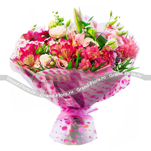 ДЕЛЮКС: лилия розовая -  3 шт, альстромерия розовая - 21 шт, эустома розовая - 11 шт, эустома белая  -  10 шт, декоративная зелень, фетр розовый. Примерный диаметр букета 50х50 см.