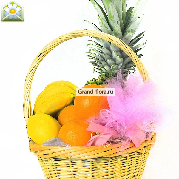 Стандартный: бананы - 1,5 кг, ананас - 1 шт., апельсины - 2кг, лимон - 2 шт., бант, декор, корзина средняя.