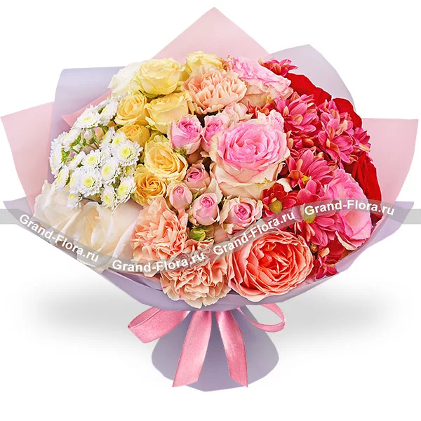 Уменьшенный: роза красная - 1 шт., роза розовая - 1 шт., роза белая - 1 шт., хризантема кустовая розовая - 1 шт., роза кустовая розовая - 1 шт., кустовая роза кремовая - 1 шт., хризантема сантини - 1 шт., гвоздика персиковая - 2 шт., упаковка, лента.